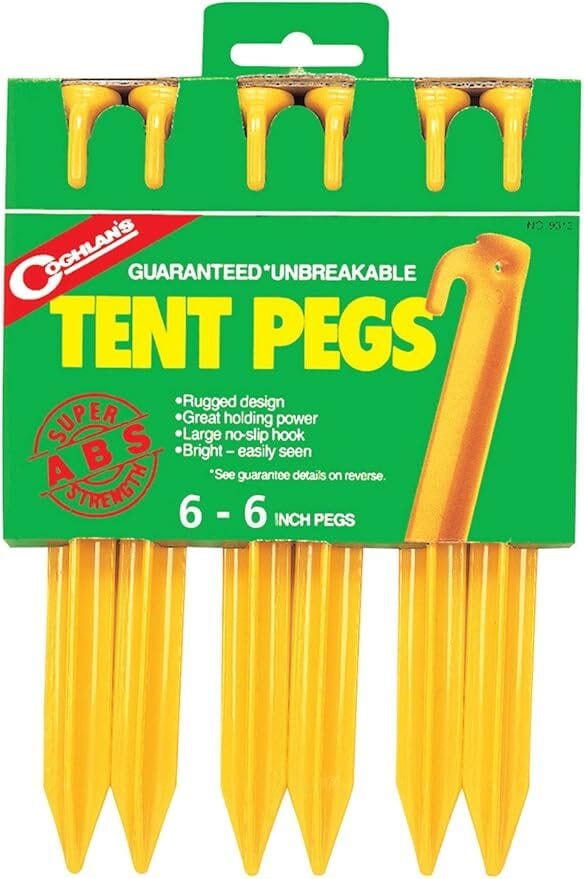 Coghlan's ABS Tent Pegs are a lightweight and affordable option for campers. Made from durable ABS plastic, these stakes are perfect for soft ground and come in a bright yellow color for high visibility.