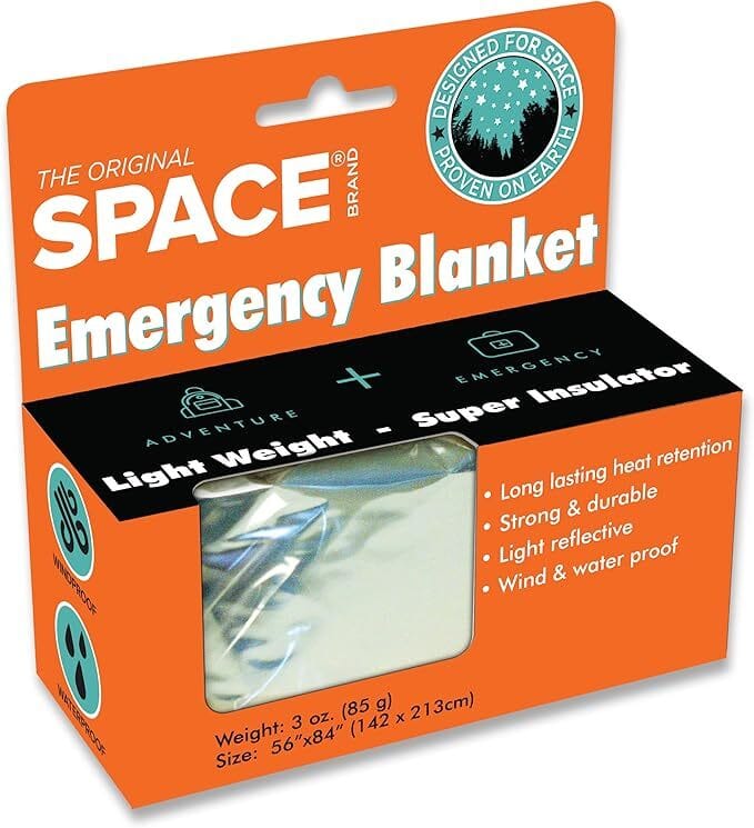 Also known as an emergency blanket or mylar blanket, a space blanket is a lightweight, compact, and portable essential designed to provide warmth and protection during emergencies. Constructed from a thin, high-strength plastic called polyethylene terephthalate (mylar) and coated with a thin layer of aluminum, these blankets reflect up to 90% of radiated body heat. This reflective surface helps retain your body heat, keeping you warm and dry when it matters most. Space blankets are a must-have in survival kits and invaluable for outdoor activities like hiking and camping. Whether facing sudden cold snaps or unexpected storms, a space blanket is your first line of defense against the elements. They’re also commonly found in first aid kits for emergency use.