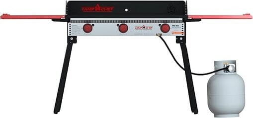 Features three high-pressure burners with independent controls for simultaneous cooking. Compatible with insect screen guards for added safety.
