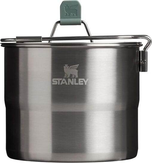 The Stanley Adventure Base Camp Cook Set is a stainless steel camping gear mess kit that includes 8 pieces, from pots and pans to dishes to utensils for eating. It’s designed to cater to a group of four, making it ideal for family camping trips.