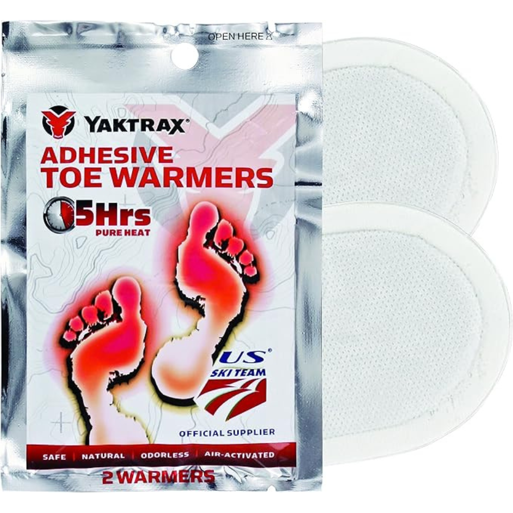 Yaktrax Toe Warmers provide targeted heat for toes. Their adhesive backing sticks securely to socks, delivering up to 5 hours of warmth.